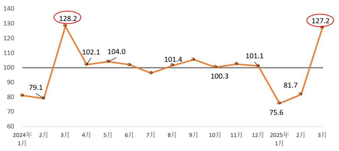 2025年3月份建筑材料工业景气指数为127.2点,高于临界点,处于景气区间,比1、2月份明显回升,回升幅度不及上年同期。1、2月份为建筑材料市场传统“淡季”,受春节假期因素影响,下游需求明显减弱,建材企业生产放缓,建筑材料工业景气指数回落至临界点以下。春节过后,建材企业复工复产加快,行业景气度出现回升,3月份随着气候等季节性因素变化,以及下游建筑业、制造业需求市场逐步启动,建材企业生产加快,行业景气度明显回升。
