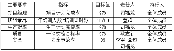 班组成员:李军、蒋涛涛、耿志新、董超、司福龙、聂伟、邱伟、付明、胡杰、陈伟、殷杰、胡连伟、宋同利、杨寿凯、俞茂为实现“打造绿色化、数字化高端玻璃制造装备的压延机装配组”班组目标,班组根据公司的战略规划及车间的年度计划,将本班组的工作任务按照公司及车间目标的分解,在本班组建立关键绩效指标,制作了年度工作目标(见表1-1)。表1-1 年度工作目标